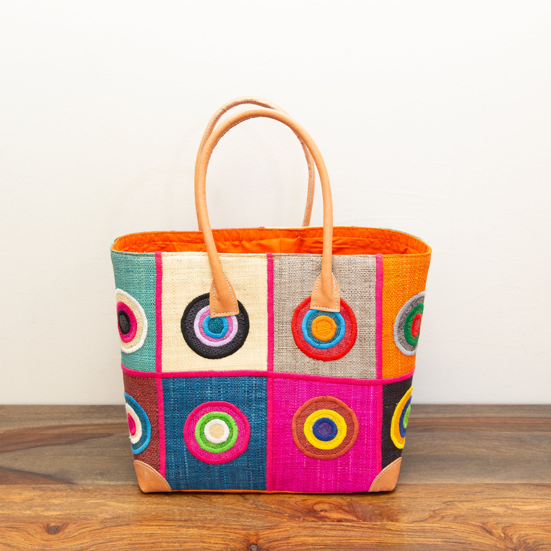 Add bold color and artisan craftsmanship to your everyday with our fair-trade Madagascar Abstract Design Raffia Handbag. Expertly handwoven by skilled artisans using natural raffia grass and palm leaves, each bag features a unique abstract pattern in vibrant colors. The spacious interior includes a coordinating cloth drawstring closure and a sewn-in pocket for easy organization. Durable tan leather handles and reinforced leather corners provide lasting strength and structure.