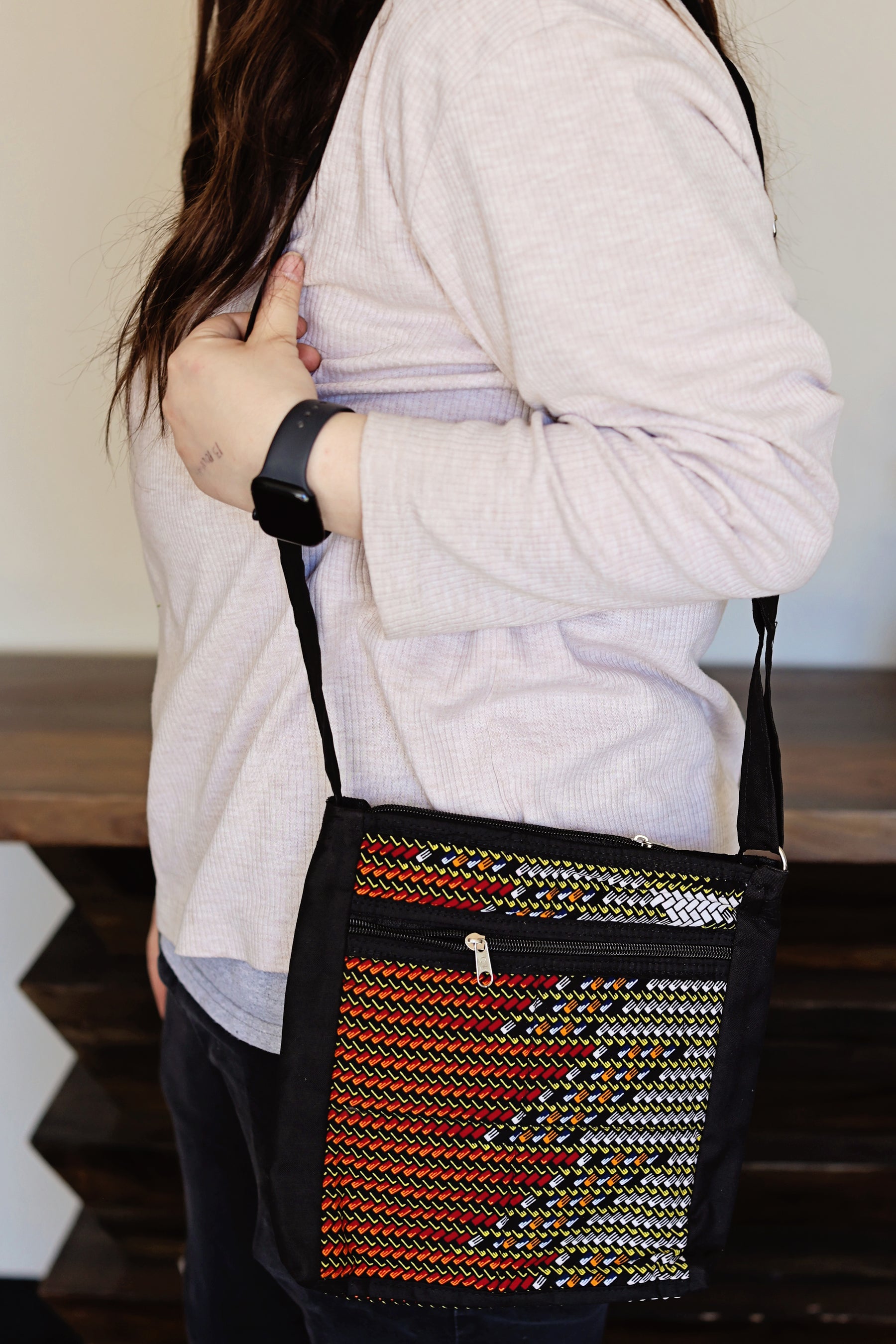 Recycled fabric crossbody bag with zipper closure detail handmade in Kenya