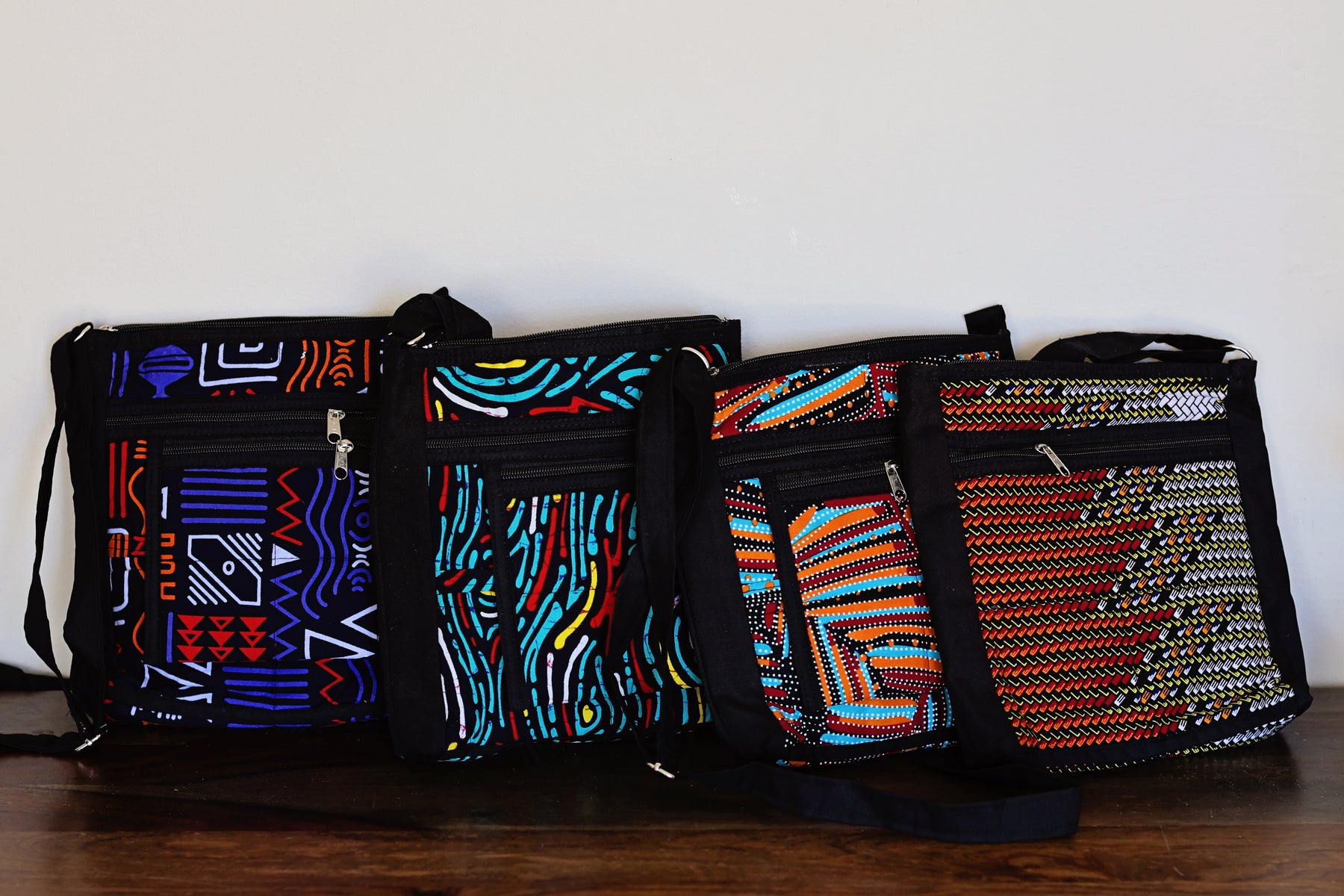 Assorted Lee crossbody bags made from up-cycled African fabric